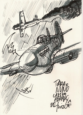 A pequena mas interessante exposição que esteve no festival, mostrou alguns dos seus trabalhos nomeadamente uma curiosa obra sobre tubarões voadores. Mas foi nas sessões de autógrafos que Luiz Gê se deu a conhecer. Revelando uma grande grande disponibilidade, um peculiar sentido de humor e munido de dois marcadores (preto e cinza), brindou-nos com magníficos desenhos sobre a temática da aviação. O resultado final foi uma das boas surpresas do festival deste ano. Deixo aqui alguns exemplos que marcaram a passagem deste autor brasileiro pelo Amadora BD.