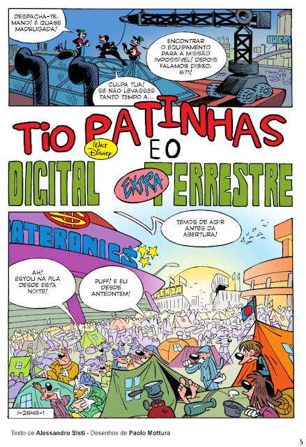 Na edição desta semana, o Tio Patinhas está ao comando! Neste caso, na primeira história em destaque, os quadrados assumem a forma de televisões, enquanto o pato mais avarento de Patópolis e o seu eterno rival Patacôncio esgrimem argumentos para deter o domínio do negócios das operadoras televisivas! Não percas esta mirabolante banda desenhada com um final inesperado! É que até visitantes de outro mundo vai meter ao barulho! Isto tudo em Tio Patinhas e o digital (extra) terrestre! Igualmente imperdível vai ser outro tipo de batalha… Esta vai opor o Zezinho a um bully. O Prof. Pardal vai dar uma ajuda neste desafio que parece desequilibrado. Falamos de Zezinho e Pardal em… Baile com o Bully! Estas e muitas outras histórias hilariantes na tua Comix de sempre!